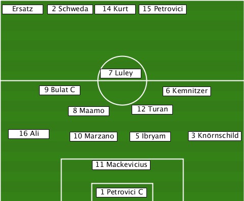 --------2 Schweda---------------- --Ersatz-------14 Kurt-15 Petrovici ---------------7 Luley----------- -------9 Bulat C--------6 Kemnitzer ----------8 Maamo---12 Turan------ ---16 Ali---10 Marzano-5 Ibryam-3 Knörnschild --------------11 Mackevicius----- --------------1 Petrovici C------