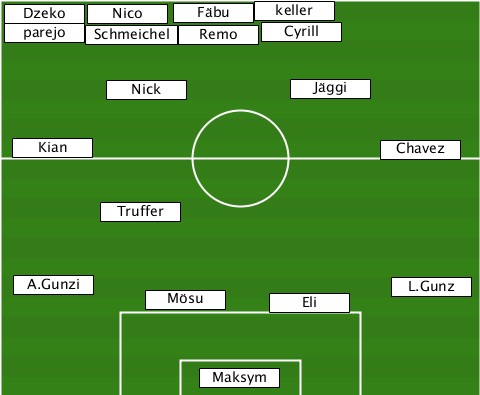 ------------------keller--------- --Dzeko-Nico---Fäbu---------------- --parejo-Schmeichel-Remo-Cyrill----- ---------Nick---------Jäggi------- --Kian----------------------Chavez --------Truffer------------------ --A.Gunzi---Mösu-----Eli-------L.Gunz ---------------Maksym------------