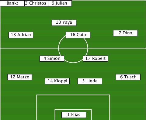 ------------9 Julien------------- -Bank:-2 Christos----------------- -------------10 Yaya------------- ---13 Adrian-----16 Cata----7 Dino- ----------4 Simon----17 Robert---- ---12 Matze-14 Kloppi-5 Linde-6 Tusch ---------------1 Elias-----------