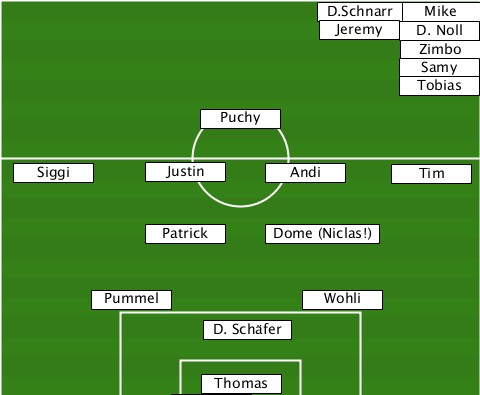 -----------------------D.Schnarr- ----------------------------Mike- -----------------------Jeremy-D. Noll ----------------------------Zimbo ----------------------------Samy- ----------------------------Tobias ---------------Puchy------------- --Siggi-----Justin---Andi------Tim-- -----------Patrick--Dome (Niclas!) --------Pummel---------Wohli------ ---------------D. Schäfer-------- ---------------Thomas------------