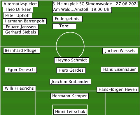 --Alternativspieler:------------- -------------6. Heimspiel: SG Simonswolde...27.06.2024 --Theo Dirksen-Am Wald...Anstoß: 19:00 Uhr --Hermann Barrenpohl-Peter Uphoff-Endergebnis: --Eduard Janssen-Tore:------------ --Gerhard Siebels---------------- --Bernhard Pflüger--------Jochen Wessels --------------Heymo Schmidt------ ---Egon Dreesch-Hero Gerdes-Hans Eisenhauer -------------Joachim Brabander--- --Willi Friedrichs-------Hans-Jürgen Heyen -------------Hermann Kemper------ --------------Hinni Leitschak----