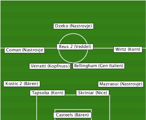 -------------Dzeko (Nastrovje)--- --Coman (Nastrovje-Reus 2 (Veddel)-Wirtz (Korn) --------Verratti (Kopfnuss)-Bellingham (Gen Italien) --Kostic 2 (Bären)------Mazraoui (Nastrovje) --------Tapsoba (Korn)-Skriniar (Nice) -------------Casteels (Bären)----