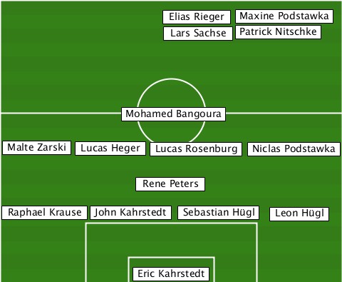 -----------------------Maxine Podstawka -----------------Elias Rieger---- -----------------Lars Sachse-Patrick Nitschke -------------Mohamed Bangoura---- --Malte Zarski-Lucas Heger-Lucas Rosenburg-Niclas Podstawka --------------Rene Peters-------- --Raphael Krause-John Kahrstedt-Sebastian Hügl-Leon Hügl --------------Eric Kahrstedt-----