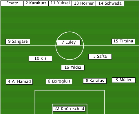 -------------11 Yüksel----------- --Ersatz-2 Karakurt-13 Hörner-14 Schweda ---9 Sangare----7 Luley------15 Tirsina --------10 Kis---------5 Safta---- ----------------16 Yildiz-------- ---4 Al Hamad-6 Eciroglu I-8 Karatas-3 Müller --------------22 Knörnschild-----