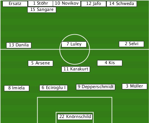 -------------10 Novikov---------- --Ersatz-1 Stöhr-----12 Jafo-14 Schweda -------15 Sangare---------------- ---13 Danila----7 Luley------2 Selvi -------5 Arsene--------4 Kis------ ---------------11 Karakurt------- --8 Imiela-6 Eciroglu I-9 Depperschmidt-3 Müller --------------22 Knörnschild-----