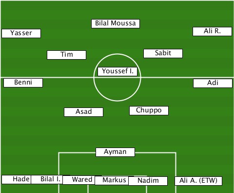 --------------Bilal Moussa------- --Yasser---------------------Ali R. --------Tim-----------Sabit------- ---------------Youssef I.-------- --Benni----------------------Adi-- ----------Asad------Chuppo-------- ---------------Ayman------------- --Hade-Bilal I.-Wared-Markus-Nadim-Ali A. (ETW)