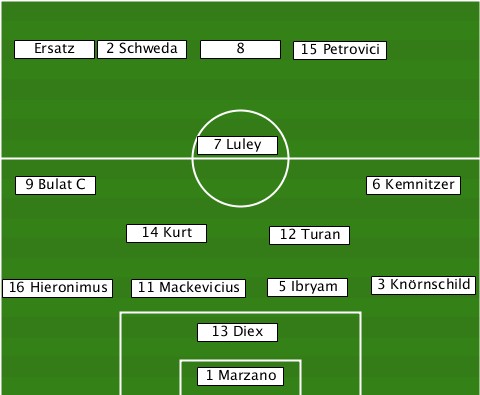 --------2 Schweda---------------- --Ersatz--------8------15 Petrovici ---------------7 Luley----------- --9 Bulat C----------------6 Kemnitzer ----------14 Kurt---12 Turan------ --16 Hieronimus-11 Mackevicius-5 Ibryam-3 Knörnschild ---------------13 Diex----------- ---------------1 Marzano---------