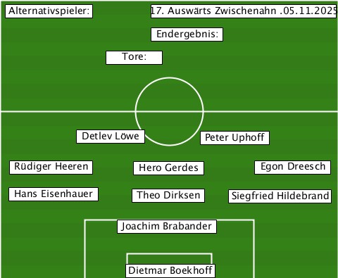 --Alternativspieler:------------- ----------------17. Auswärts Zwischenahn .05.11.2025 ----------------Endergebnis:----- -----------Tore:----------------- ---------Detlev Löwe-Peter Uphoff- --Rüdiger Heeren-Hero Gerdes-Egon Dreesch --Hans Eisenhauer-Theo Dirksen-Siegfried Hildebrand -------------Joachim Brabander--- -------------Dietmar Boekhoff----