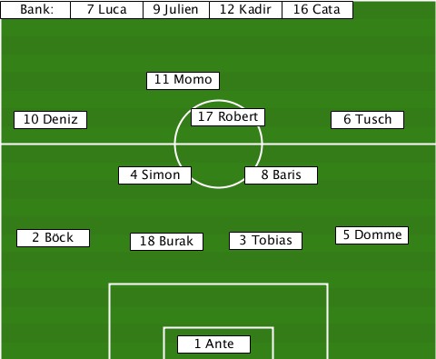 -Bank:--------------------------- -------7 Luca-9 Julien-12 Kadir-16 Cata ------------11 Momo-------------- --10 Deniz------17 Robert---6 Tusch ----------4 Simon---8 Baris------- ---2 Böck---18 Burak-3 Tobias-5 Domme --------------1 Ante-------------