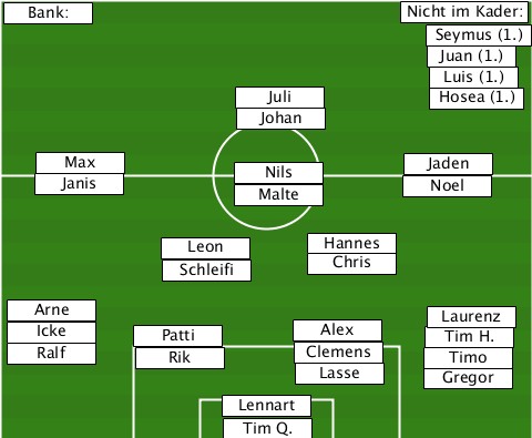 --------------------------Nicht im Kader: --Bank:-------------------------- ---------------------------Seymus (1.) ---------------------------Juan (1.) ---------------------------Luis (1.) ----------------Juli--------Hosea (1.) ----------------Johan------------ ----Janis-Max-----Nils-Malte--Noel-Jaden -----------Leon-Schleifi-Hannes-Chris --Arne-Icke-Ralf-Patti-Rik-Alex-Clemens-Lasse-Timo-Gregor-Tim H.-Laurenz ---------------Lennart----------- ---------------Tim Q.------------