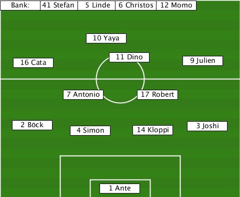 -------41 Stefan----------------- -Bank:-------5 Linde-6 Christos-12 Momo -------------10 Yaya------------- ---16 Cata-------11 Dino----9 Julien ----------7 Antonio--17 Robert---- ---2 Böck---4 Simon--14 Kloppi-3 Joshi ---------------1 Ante------------