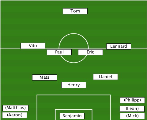 ---------------Tom--------------- ------Vito----------------Lennard- ------------Paul---Eric----------- --------Mats-----------Daniel----- ---------------Henry------------- ----------------------------(Philipp) --(Matthias)-----------------(Leon) --(Aaron)------Benjamin-------(Mick)