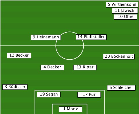 --------------------------5 Wirthensohn ---------------------------11 Jawecki ----------------------------10 Öhre ---------9 Heinemann-14 Pfaffstaller ---12 Becker--------------20 Böckenholt -----------4 Decker-13 Ritter----- --3 Rüdisser---------------6 Schleicher ----------19 Segan--17 Pur-------- ---------------1 Monz------------
