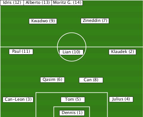 -Idris (12)---------------------- -------Alberto (13)-Moritz G. (14) --------Kwadwo (9)---Zineddin (7)- ---Paul (11)----Lian (10)---Klaudek (2) ----------Qasim (6)-Can (8)------- --Can-Leon (3)--Tom (5)-----Julius (4) ---------------Dennis (1)--------
