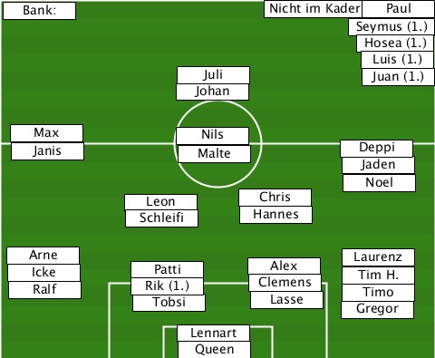---------------------Nicht im Kader: --Bank:----------------------Paul- ---------------------------Seymus (1.) ----------------------------Hosea (1.) ----------------------------Luis (1.) --------------Juli-----------Juan (1.) --------------Johan-------------- --Max-Janis-----Nils-Malte----Deppi-Jaden ---------------------------Noel-- -----------Leon-Schleifi-Chris-Hannes --Arne-Icke-Ralf-Patti-Rik (1.)-Tobsi-Alex-Clemens-Lasse-Gregor-Laurenz-Tim H.-Timo --------------Lennart------------ ---------------Queen-------------