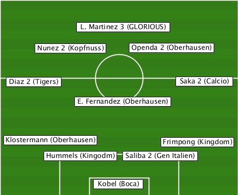 ------------L. Martinez 3 (GLORIOUS) ------Nunez 2 (Kopfnuss)-Openda 2 (Oberhausen) --Diaz 2 (Tigers)---------Saka 2 (Calcio) -----------E. Fernandez (Oberhausen) --Klostermann (Oberhausen)-Frimpong (Kingdom) -------Hummels (Kingodm)-Saliba 2 (Gen Italien) --------------Kobel (Boca)-------
