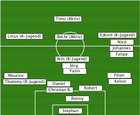 --------------Timo (Aktiv)------- ---Linus (A-Jugend)-Becht (Aktiv)-Edonit (B-Jugend) ---------------------------Nico-- ---------------------------Johannes ---------------------------Felipe --------------Nils (B-Jugend)---- ----------------Jörg------------- --Maurice--------Yasin------Filian- --Thommy (B-Jugend)-Daniel--Kelvin- ------------Christian B.-Robert--- ----------------Ronny------------ ---------------Stephan-----------