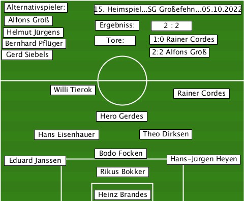 --Alternativspieler:------------- --------------15. Heimspiel...SG Großefehn...05.10.2022 --Bernhard Pflüger-Helmut Jürgens-Alfons Größ-Tore:-Ergebniss:-1:0 Rainer Cordes-2 : 2 --Gerd Siebels--------2:2 Alfons Größ --------Willi Tierok-----Rainer Cordes --------------Hero Gerdes-------- ------Hans Eisenhauer-Theo Dirksen --Eduard Janssen-Bodo Focken-Hans-Jürgen Heyen --------------Rikus Bokker------- --------------Heinz Brandes------