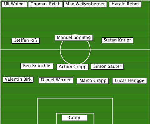 -------------------------Harald Rehm --Uli Waibel-Thomas Reich-Max Weißenberger ----Steffen Riß-Manuel Sonntag-Stefan Knüpf ------Ben Brauchle-Achim Grapp-Simon Sauter --Valentin Birk-Daniel Werner-Marco Grapp-Lucas Hengge ---------------Corni-------------