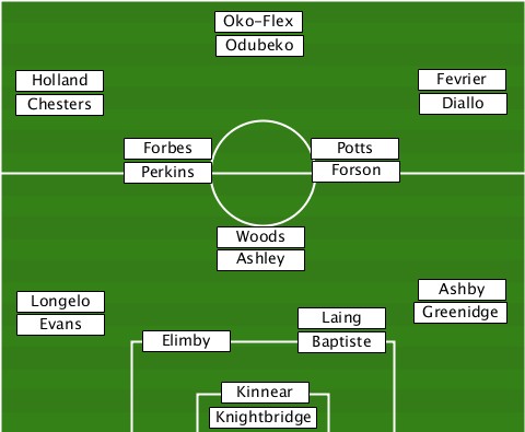 ---------------Oko-Flex---------- ---------------Odubeko----------- --Holland-------------------Fevrier --Chesters------------------Diallo ---------Forbes------Potts-------- ---------Perkins-----Forson------- ---------------Woods------------- ---------------Ashley------------ --Longelo-Evans-------Laing---Greenidge-Ashby ----------Elimby-----Baptiste----- ---------------Kinnear----------- --------------Knightbridge-------