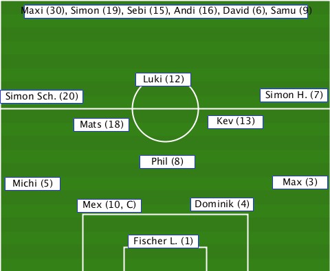 ----Maxi (30), Simon (19), Sebi (15), Andi (16), David (6), Samu (9) ---------------Luki (12)--------- -Simon Sch. (20)------------Simon H. (7) ---------Mats (18)-----Kev (13)--- ---------------Phil (8)---------- --Michi (5)------------------Max (3) ---------Mex (10, C)-Dominik (4)-- --------------Fischer L. (1)-----