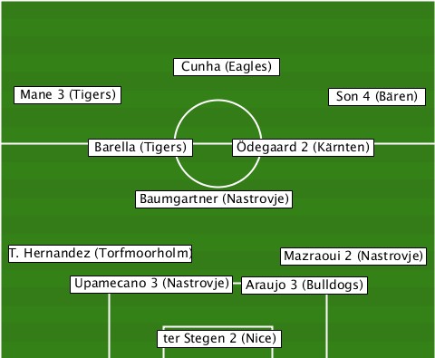 --------------Cunha (Eagles)----- --Mane 3 (Tigers)----------Son 4 (Bären) --------Barella (Tigers)-Ödegaard 2 (Kärnten) -----------Baumgartner (Nastrovje) --T. Hernandez (Torfmoorholm)-Mazraoui 2 (Nastrovje) -------Upamecano 3 (Nastrovje)-Araujo 3 (Bulldogs) -------------ter Stegen 2 (Nice)-