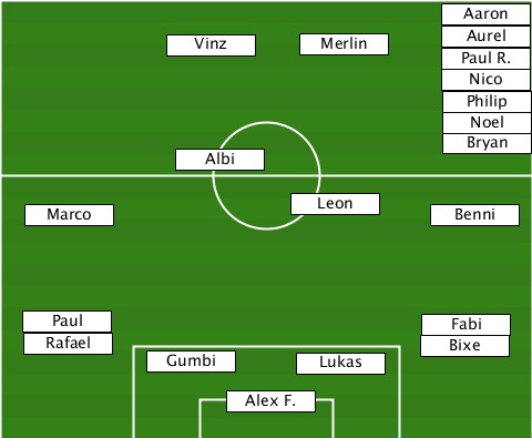 ----------------------------Aaron -----------Vinz-----Merlin----Aurel-Paul R. ----------------------------Nico- ----------------------------Philip ----------------------------Noel- ----------------------------Bryan ------------Albi----------------- ---Marco------------Leon-----Benni- ---Paul---------------------Fabi-- ---Rafael--Gumbi-----Lukas----Bixe-- ---------------Alex F.-----------