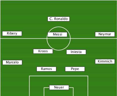 --------------C. Ronaldo--------- --Ribery-------Messi---------Neymar -----------Kroos-----Iniesta------ --Marcelo-------------------Kimmich -----------Ramos----Pepe---------- ---------------Neuer-------------