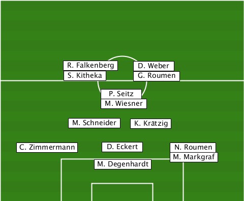 ----------R. Falkenberg---------- -------------------D. Weber------ ----------S. Kitheka-G. Roumen---- ---------------P. Seitz---------- ---------------M. Wiesner-------- ----------M. Schneider-K. Krätzig- ----C. Zimmermann-D. Eckert-N. Roumen --------------M. Degenhardt-M. Markgraf