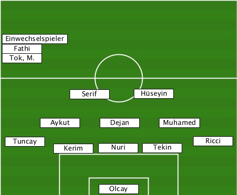 --Einwechselspieler-------------- --Fathi-------------------------- --Tok, M.------------------------ -----------Serif-----Hüseyin------ -------Aykut----Dejan----Muhamed--- --Tuncay--Kerim--Nuri---Tekin---Ricci ---------------Olcay-------------