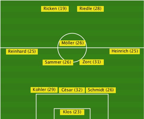 -----------Ricken (19)----------- -------------------Riedle (28)--- ---------------Möller (26)------- ---Reinhard (25)-----------Heinrich (25) -----------Sammer (26)-Zorc (31)-- --------Kohler (29)-César (32)-Schmidt (26) ---------------Klos (23)---------