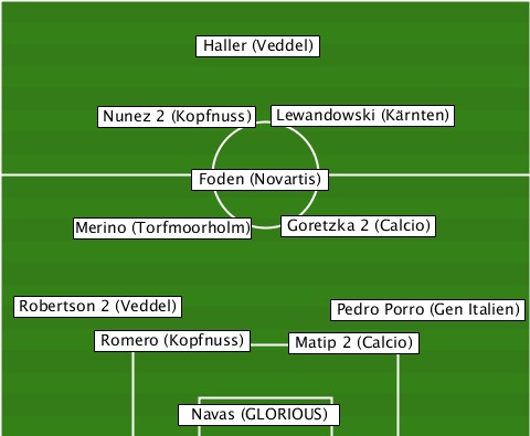 -------------Haller (Veddel)----- -------Nunez 2 (Kopfnuss)-Lewandowski (Kärnten) -------------Foden (Novartis)---- ------Merino (Torfmoorholm)-Goretzka 2 (Calcio) --Robertson 2 (Veddel)-Pedro Porro (Gen Italien) -------Romero (Kopfnuss)-Matip 2 (Calcio) ------------Navas (GLORIOUS)-----