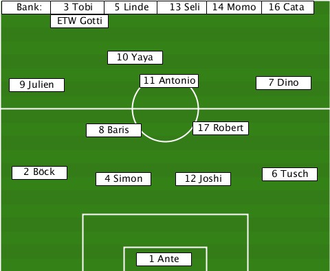 ------------5 Linde-------------- --Bank:-3 Tobi-----13 Seli-14 Momo-16 Cata ------ETW Gotti------------------ ------------10 Yaya-------------- --9 Julien------11 Antonio--7 Dino- ----------8 Baris----17 Robert---- ---2 Böck---4 Simon-12 Joshi--6 Tusch ---------------1 Ante------------