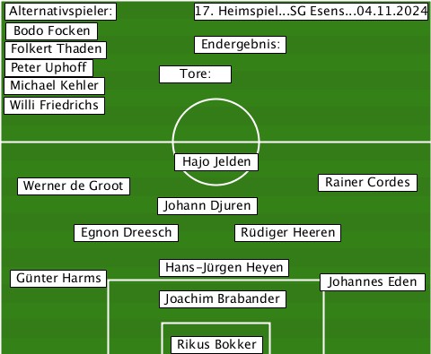 --Alternativspieler:------------- ----------------17. Heimspiel...SG Esens...04.11.2024 --Bodo Focken-------------------- --Folkert Thaden-Endergebnis:----- --Michael Kehler-Peter Uphoff-Tore: --Willi Friedrichs--------------- --------------Hajo Jelden-------- ---Werner de Groot--------Rainer Cordes -------------Johann Djuren------- -------Egnon Dreesch-Rüdiger Heeren --Günter Harms-Hans-Jürgen Heyen-Johannes Eden -------------Joachim Brabander--- --------------Rikus Bokker-------