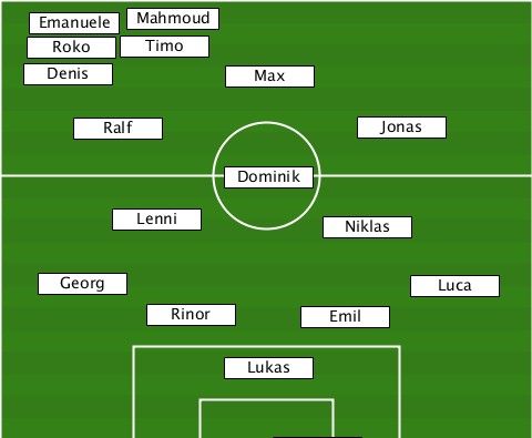 ---------Mahmoud----------------- ---Emanuele---------------------- ---Roko---Timo-------------------- ---Denis--------Max--------------- ------Ralf--------------Jonas----- ---------------Dominik----------- --------Lenni---------Niklas------ ----Georg------------------Luca--- ----------Rinor------Emil--------- ---------------Lukas-------------