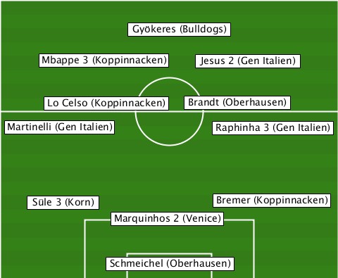 --------------Gyökeres (Bulldogs) -----Mbappe 3 (Koppinnacken)-Jesus 2 (Gen Italien) ------Lo Celso (Koppinnacken)-Brandt (Oberhausen) --Martinelli (Gen Italien)-Raphinha 3 (Gen Italien) ----Süle 3 (Korn)------Bremer (Koppinnacken) ------------Marquinhos 2 (Venice) -----------Schmeichel (Oberhausen)
