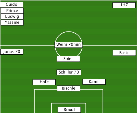 -Guido--------------------------- ----------------------------1HZ-- --Prince------------------------- --Ludwig------------------------- --Yassine------------------------ --------------Weini 70min-------- --Jonas 70-------------------Baste ---------------Spieli------------ ---------------Schiller 70------- ---------Hofe---------Kamil------- ---------------Bischle----------- ---------------Roudl-------------