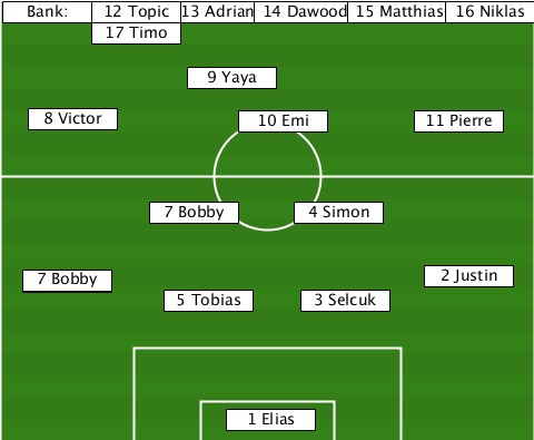 ----------------------15 Matthias --Bank:-12 Topic-13 Adrian-14 Dawood-16 Niklas -------17 Timo------------------- -------------9 Yaya-------------- ---8 Victor------10 Emi-----11 Pierre ----------7 Bobby---4 Simon------- ---6 Böck-7 Bobby------------2 Justin -----------5 Tobias-3 Selcuk------ ---------------1 Elias-----------