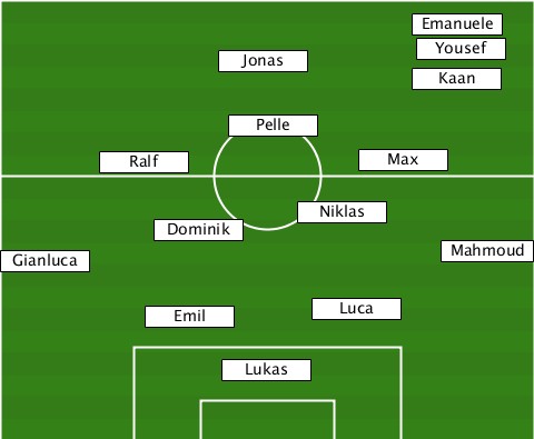 --------------------------Emanuele ---------------Jonas-------Yousef- --------------------------Kaan--- ---------------Pelle------------- -------Ralf-------------Max------- -------------------Niklas-------- -----------Dominik--------------- -Gianluca--------------------Mahmoud ----------Emil-------Luca--------- ---------------Lukas-------------