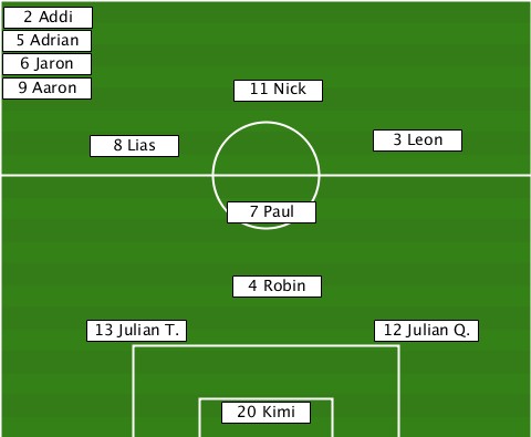 --2 Addi------------------------- --5 Adrian----------------------- --6 Jaron------------------------ --9 Aaron--------11 Nick---------- -------8 Lias------------3 Leon--- ---------------7 Paul------------ ---------------4 Robin----------- -------13 Julian T.------12 Julian Q. ---------------20 Kimi-----------