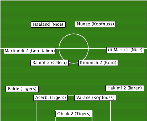 ------------------Nunez (Kopfnuss) --------Haaland (Nice)----------- --Martinelli 2 (Gen Italien)-di Maria 2 (Nice) --------Rabiot 2 (Calcio)-Kimmich 2 (Korn) ---Balde (Tigers)--------Hakimi 2 (Bären) ---------Acerbi (Tigers)-Varane (Kopfnuss) --------------Oblak 2 (Tigers)---