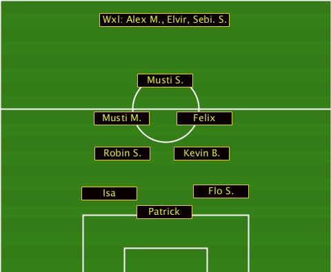 -----------Wxl: Alex M., Elvir, Sebi. S. ---------------Musti S.---------- -----------Musti M.-Felix--------- -----------Robin S.-Kevin B.------ ---------Isa---------Flo S.------- ---------------Patrick-----------