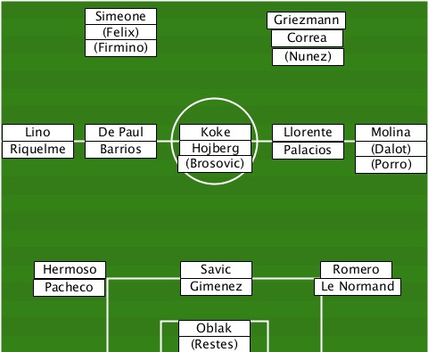 --------Simeone------------------ --------(Felix)-(Firmino)-Griezmann-Correa-(Nunez) --Lino---De Paul-Koke----Llorente-Molina --Riquelme-Barrios-Hojberg-Palacios-(Dalot) ---------------(Brosovic)----(Porro) ----Hermoso-----Savic------Romero-- ----Pacheco-----Gimenez----Le Normand ---------------Oblak------------- ---------------(Restes)----------
