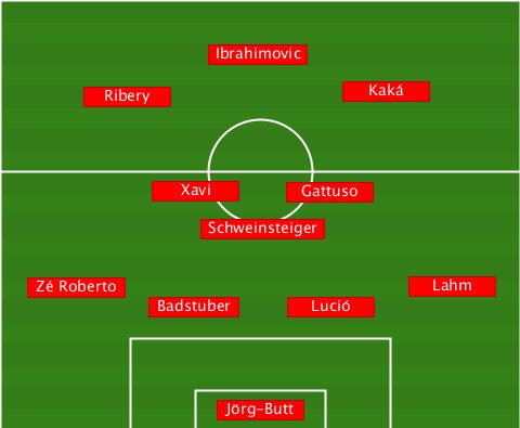 --------------Ibrahimovic-------- -------Ribery-----------Kaká------ -----------Xavi-----Gattuso------- --------------Schweinsteiger----- ---Zé Roberto---------------Lahm-- -----------Badstuber-Lució-------- ---------------Jörg-Butt---------