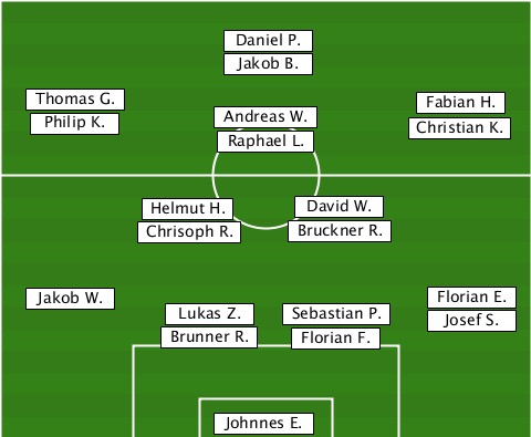 ---------------Daniel P.--------- ---------------Jakob B.---------- ---Thomas G.-Philip K.-Andreas W.-Raphael L.-Christian K.-Fabian H. ----------Helmut H.-David W.------ ----------Chrisoph R.-Bruckner R.- ---Jakob W.-Lukas Z.-Sebastian P.-Florian E.-Josef S. -----------Brunner R.-Florian F.-- --------------Johnnes E.---------