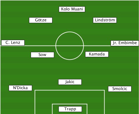 ---------------Kolo Muani-------- --------Götze-----------Lindström- --C. Lenz-------------------Jr. Embimbe ---------Sow----------Kamada------ ---------------Jakic------------- ---N'Dicka-----------------Smolcic ---------------Trapp-------------
