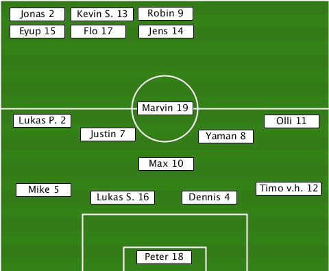 ---------------Robin 9----------- --Jonas 2-Kevin S. 13------------- --Eyup 15-Flo 17-Jens 14----------- ---------------Marvin 19--------- ---Lukas P. 2---------------Olli 11 ---------Justin 7-----Yaman 8----- ---------------Max 10------------ ---Mike 5--Lukas S. 16-Dennis 4-Timo v.h. 12 ---------------Peter 18----------
