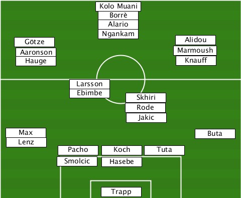 --------------Kolo Muani--------- --------------Borré-------------- --------------Alario------------- ---Götze-------Ngankam-----Alidou-- ----Aaronson-------------Marmoush- ----Hauge-----------------Knauff-- -----------Larsson--------------- -----------Ebimbe--Skhiri--------- ------------------Rode----------- ------------------Jakic---------- --Max-----------------------Buta-- --Lenz--------------------------- ---------Pacho--Koch---Tuta-------- ---------Smolcic-Hasebe----------- ---------------Trapp-------------