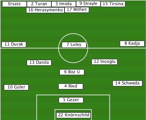 ------------------9 Strayle------ --Ersatz-2 Turan-3 Imiela--15 Tirsina -------16 Herasymenko-17 Wilfert-- --11 Durak------7 Luley-------8 Kadja -------13 Danila-------12 Incoglu- ---------------6 Boz U----------- --10 Güler-----4 Ried-------14 Schweda --------------5 Gezer------------ --------------22 Knörnschild-----