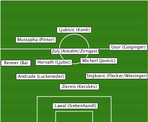 --------------Ljubicic (Koné)---- -----Mustapha (Pintor)----------- ------------Zulj (Anselm/Zirngast)-Usor (Goiginger) --Renner (Ba)-Horvath (Ljubic)-Michorl (Jovicic) -----Andrade (Luckeneder)-Stojkovic (Flecker/Wiesinger) --------------Ziereis (Kecskés)-- -------------Lawal (Siebenhandl)-